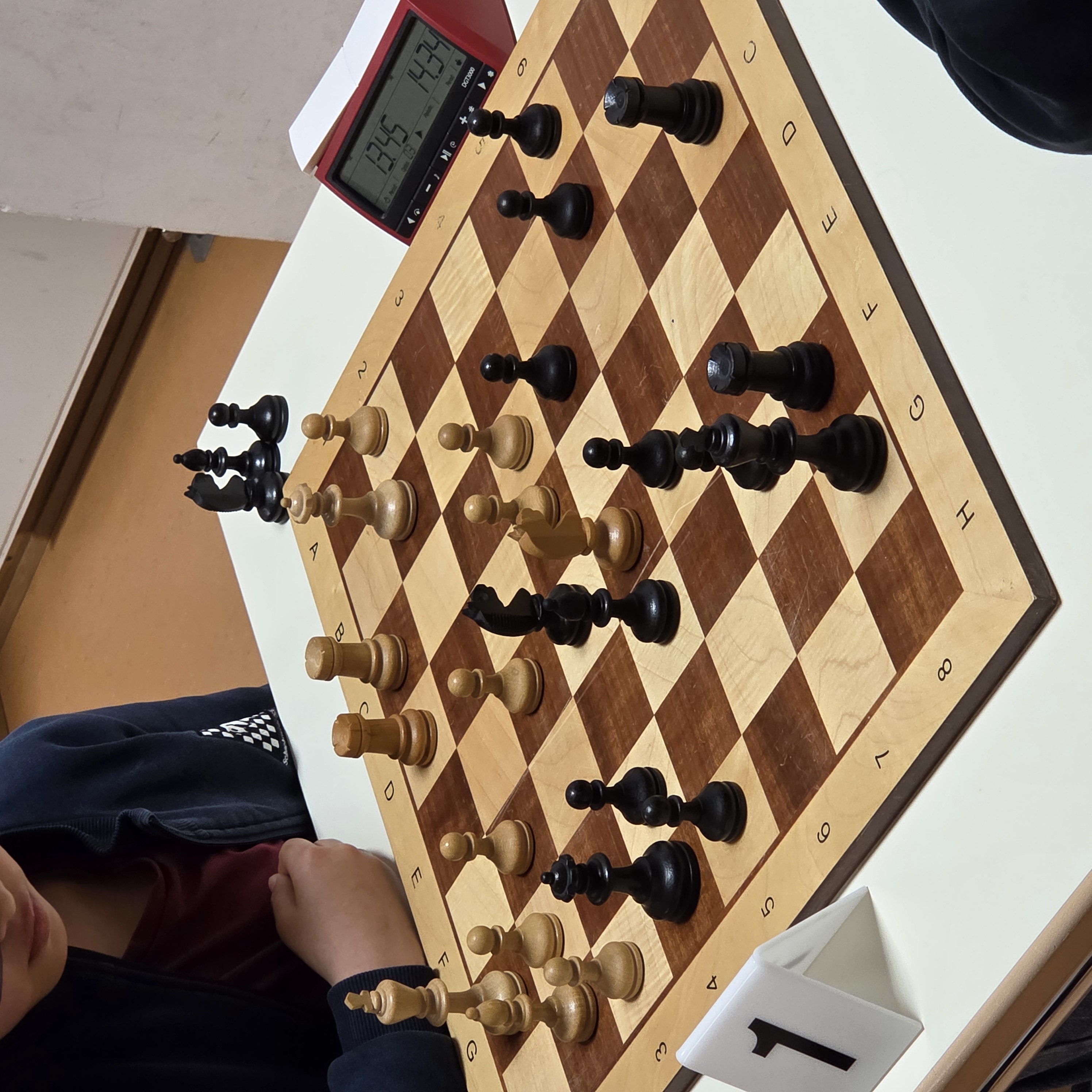 Die Kelkheimer Jungs und Mädels fuhren an den Weißbrettern ihre spanische Armada auf, so dass die Hofheimer sich erst einmal kurz sammeln mussten. Jan, Lars und Rüya holten dann schnell die ersten 3 Punkte und Harun hätte fast nachgezogen, aber seine Freibauern wurden alle vom gegnerischen Läufer aufgehalten. Mit 3:1 im Rücken riskierte Denis mit Schwarz nicht mehr allzu viel und lenkte seine Partie in ein Remis durch Zugwiederholung. An den ersten 3 Brettern ging es deutlich ruhiger zu, hier entschieden dann Kleinigkeiten und keine taktischen Figurengewinne. Pech hatte Ekin, als er die Dame auf einem bedrohten Feld plötzlich losließ und er sie nicht mehr in Sicherheit ziehen konnte. Ein anderes Unglück widerfuhr Eylem, deren Gegner durch etwas schnelleres Ziehen im Endspiel in Zeitvorteil kam und Eylem über die Zeit hob. In höchster Zeitnot waren auch die Kontrahenten am ersten Brett. Louis behielt mit nur noch 11 Sekunden den Überblick und die Opposition im Auge, so dass er gekonnt patt spielte.